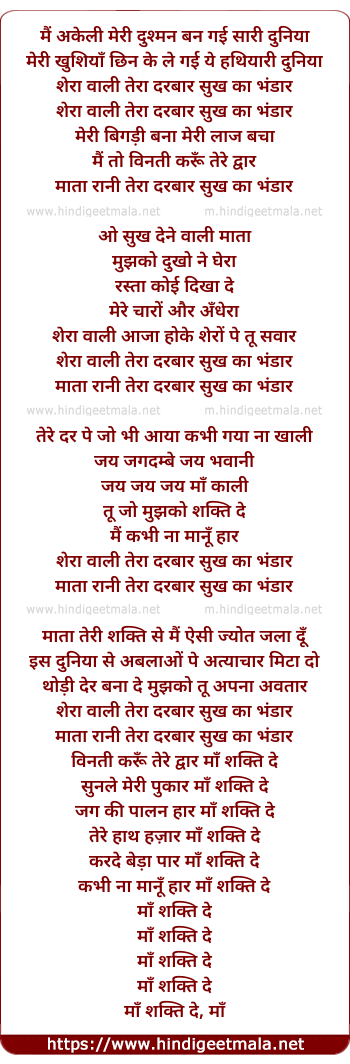 Lyrics of Shera Wali Tera Darbar - शेरा वाली तेरा दरबार