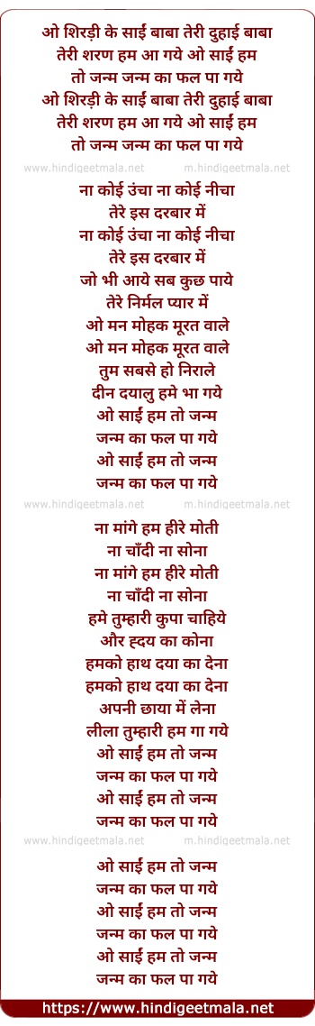 Lyrics of Shirdi Sai Baba Tera Duhaai - ओ शिरड़ी के साईं बाबा तेरी दुहाई बाबा