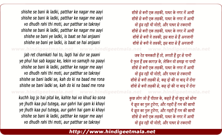 Lyrics of Shishe Se Bani Ik Ladaki, Patthar Ke Nagar Me Aayi - शीशे से बनी एक लड़की, पत्थर के नगर में आयी