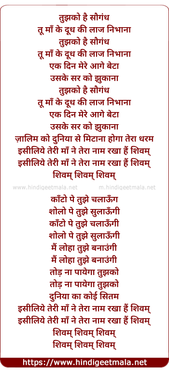 Lyrics of Tujhko Hai Saugand Tu Maa Ke Dud Ki Laaz Nibhana (Shivam Shivam) - तुझको है सौगंध तू माँ के दूध की लाज निभाना (शिवम् शिवम् )