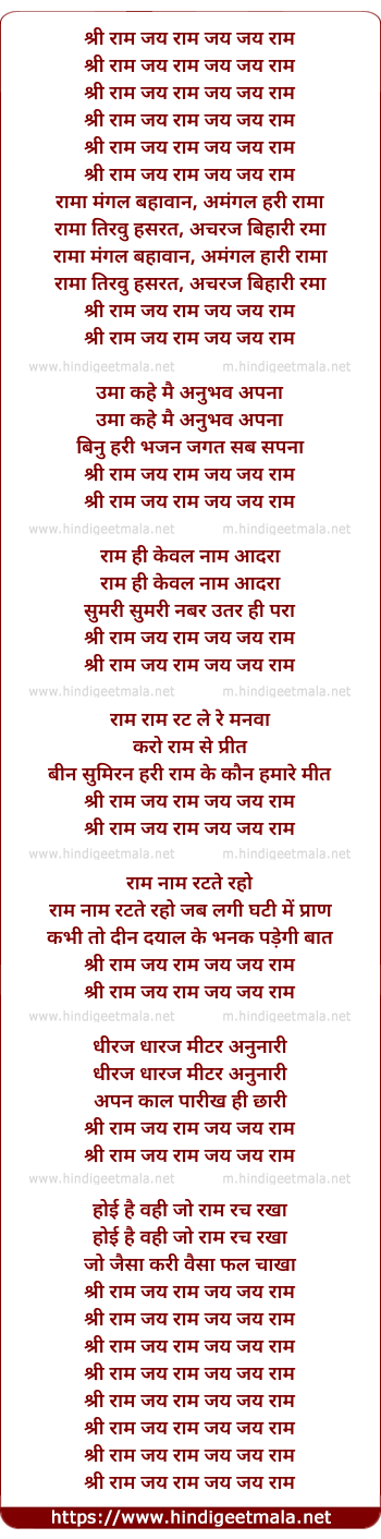 Lyrics of Shri Raam Jai Ram Jai Ram - श्री राम जय राम जय राम