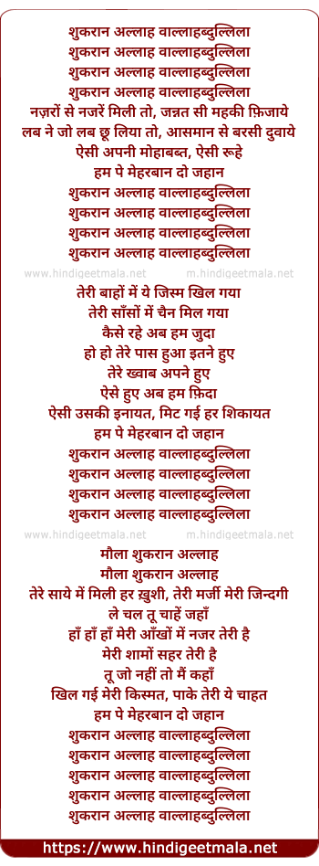 Lyrics of Shukran Allah - शुकरान अल्लाह