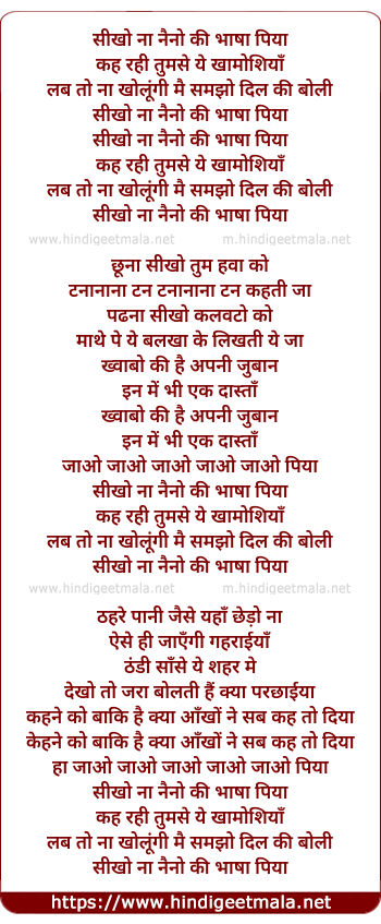Lyrics of Sikho Na Naino Kee Bhasha Piya - सीखो ना नैनो की भाषा पिया