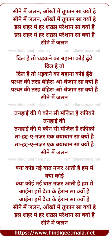 Lyrics of Sine Men Jalan Aankhon Men Tufaan Saa Kyun Hai - सीने में जलन, आँखों में तूफ़ान सा क्यों है
