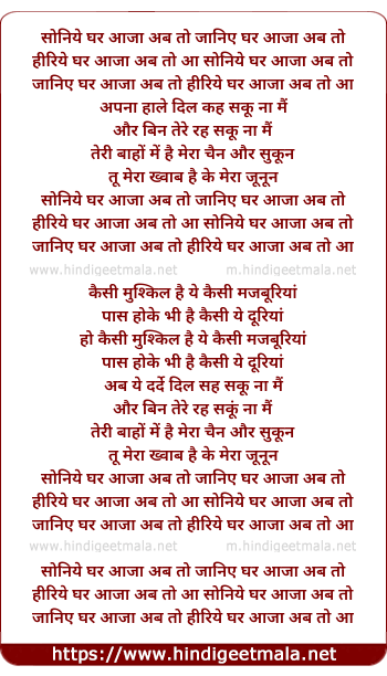 Lyrics of Soniye Ghar Aaja Ab To - सोनिये घर आजा अब तो