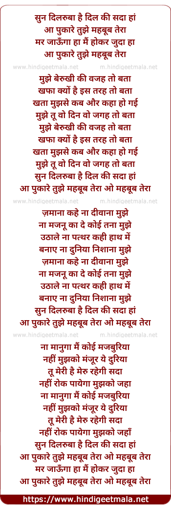 Lyrics of Sun Dilruba Hai Dil Ki Sada - सुन दिलरुबा है दिल की सदा