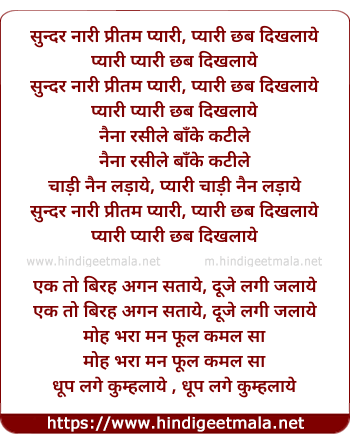 Lyrics of Sundar Naari Pritam Pyaari - सुन्दर नारी प्रीतम प्यारी