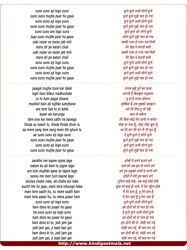 Lyrics of Suno Suno Mujhe Pyar Ho Gaya - सुनो सुनो मुझे प्यार हो गया