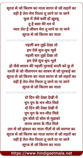Lyrics of Suraj Se Jo Kiran Ka Naata - सूरज से जो किरण का नाता