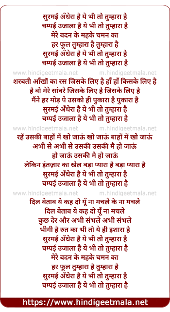 Lyrics of Surmai Andhera Hai Ye Bhi To Tumhara Hai - सुरमई अँधेरा है ये भी तो तुम्हारा है