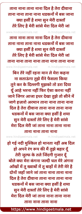 Lyrics of Taana Nana Dil Hai Tere Diwana - ताना नाना दिल है तेरा दीवाना