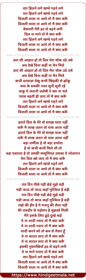 Lyrics of Taar Hilne Lage, Kahmbe Gadne Lage - तार हिलने लगे, खम्बे गड़ने लगे