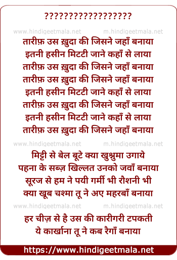 Lyrics of Taarif Us Kudaa Ki Jis Ne Jahaan Banaayaa - ??????????????????