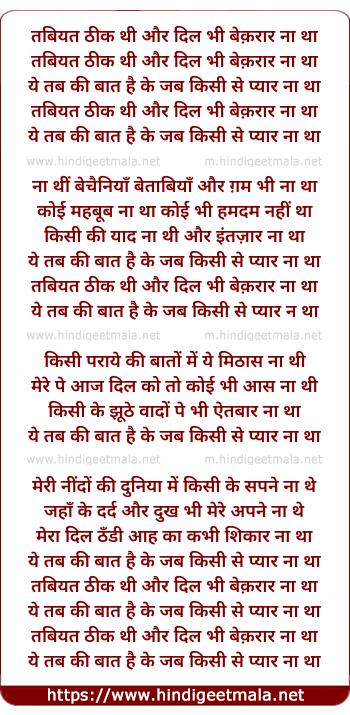 Lyrics of Tabiyat Thik Thi Aur Dill Bhi Beqarar Na Tha - तबियत ठीक थी और दिल भी बेक़रार ना था