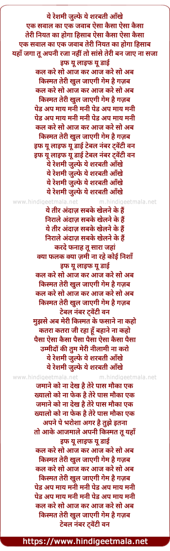 Poetic Translation - Lyrics of Table No.21 - ये रेशमी जुल्फे ये शरबती आँखे