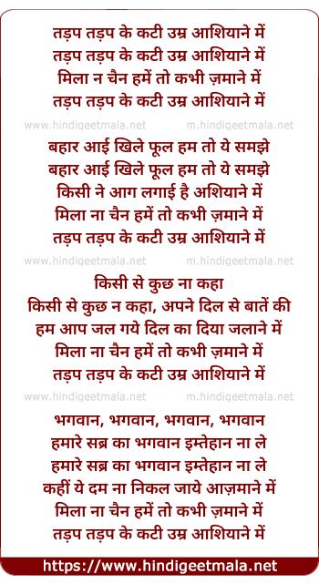 Lyrics of Tadap Tadap Ke Kati Umar Aashiyane Me - तड़प तड़प के कटी उम्र आशियाने में