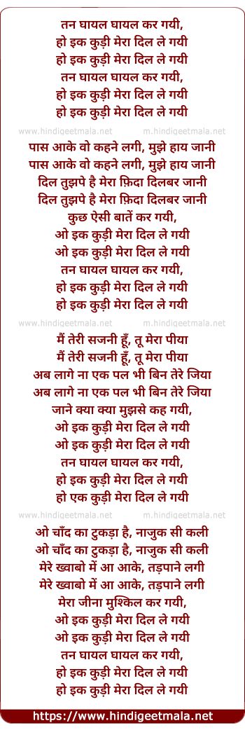 Lyrics of Tan Ghaayal Ghaayal Kar Gayi - तन घायल घायल कर गयी, हो इक कुड़ी मेरा दिल ले गयी