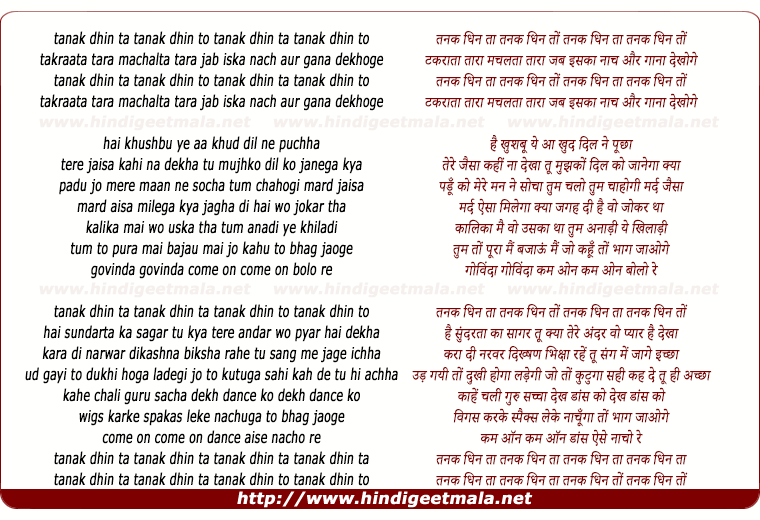 Lyrics of Tanak Dhin Ta, Tanak Dhin To - तनक धिन ता, तनक धिन तो