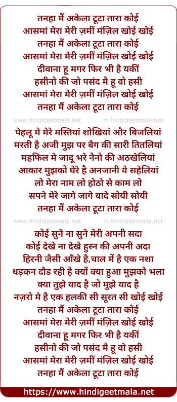 Lyrics of Tanha Mai Akela Toota Tara Koi - तनहा मैं अकेला टुटा तारा कोई
