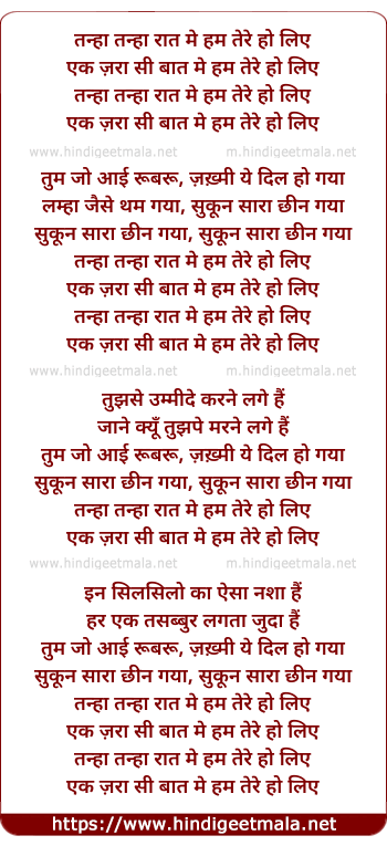 Lyrics of Tanha Tanha Rat Me, Ham Tere Ho Liye - तन्हा तन्हा रात मे, हम तेरे हो लिए