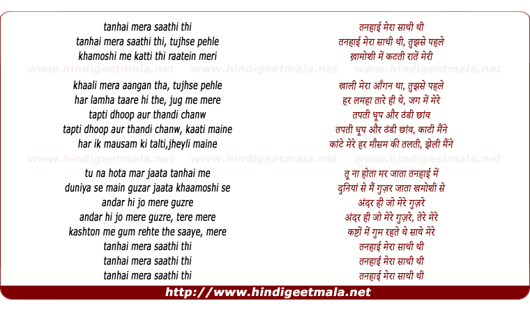 Lyrics of Tanhaai - तनहाई मेरा साथी थी