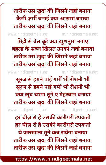 Lyrics of Tarif Us Khuda Ki Jisne Jahan Banaya - तारीफ उस खुदा की जिसने जहां बनाया