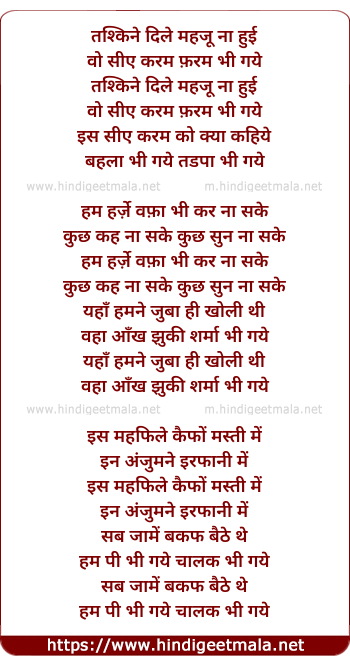 Lyrics of Taskeene Dile Mehzu Na Hui - तश्किने दिले महजू ना हुई