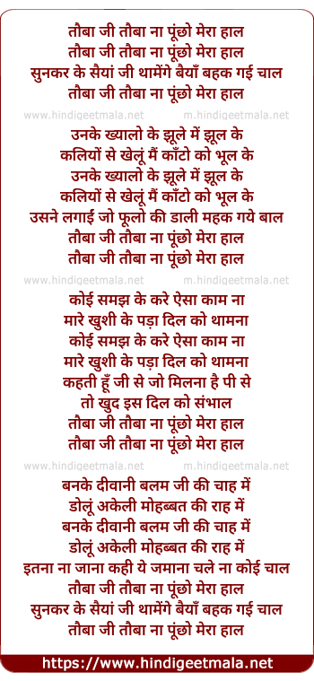 Lyrics of Tauba Ji Tauba Na Poochho Mera Haal - तौबा जी तौबा ना पूंछो मेरा हाल