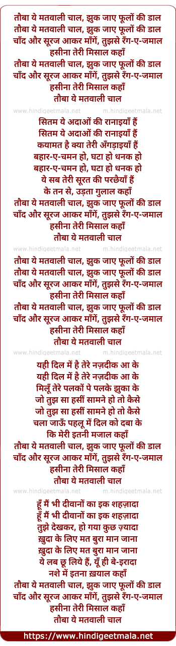 Lyrics of Tauba Ye Matwali Chaal, Jhuk Jaae Phulo Ki Daal - तौबा ये मतवाली चाल, झुक जाए फूलों की डाल