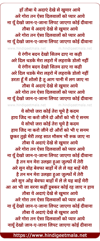 Lyrics of Tauba Ye Adaye Dekhe Se Khumar Aaye - तौबा ये अदाएं देखे से खुमार आये