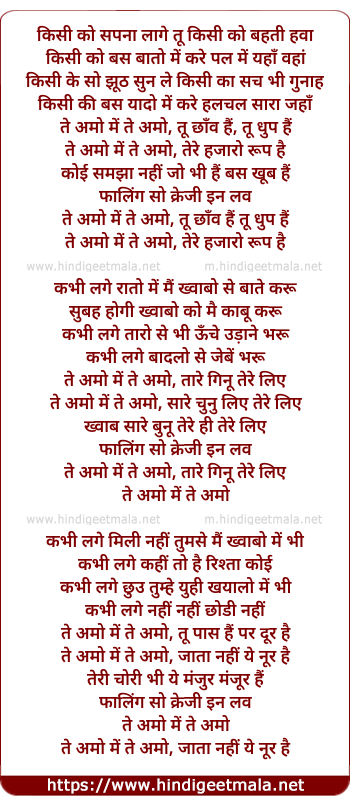 Lyrics of Te Amo Me Te Amo, Tu Chao Hai Tu Dhoop Hai - ते अमो में ते अमो, तू छाँव हैं तू धुप हैं