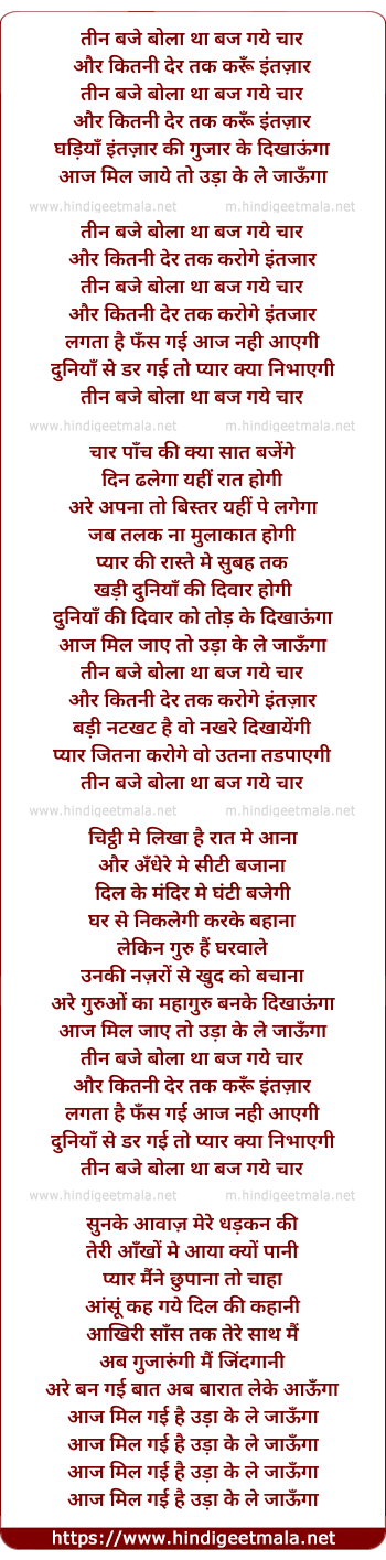 Lyrics of Teen Baje Bola Tha Baj Gaye Chaar - तीन बजे बोला था बज गये चार