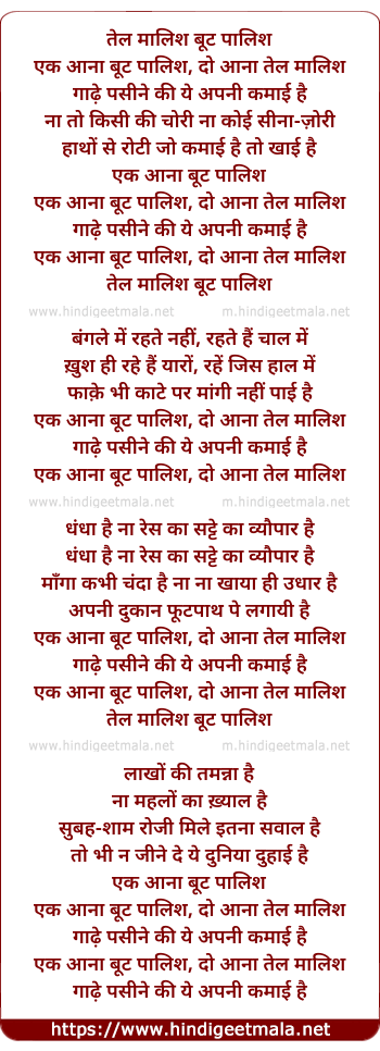 Poetic Translation - Lyrics of Tel Malish Boot Paalish - तेल मालिश बूट पालिश