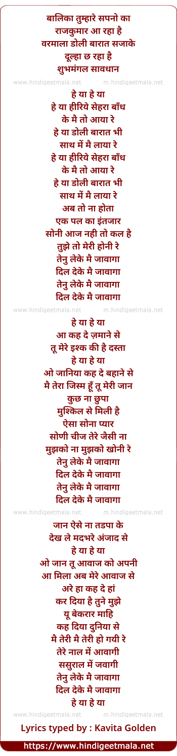Lyrics of Tenu Leke Mai Javanga - तेनु लेके मैं जावांगा