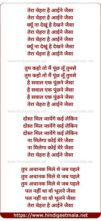 Lyrics of Tera Chehra Hai - तेरा चेहरा है आईने जैसा