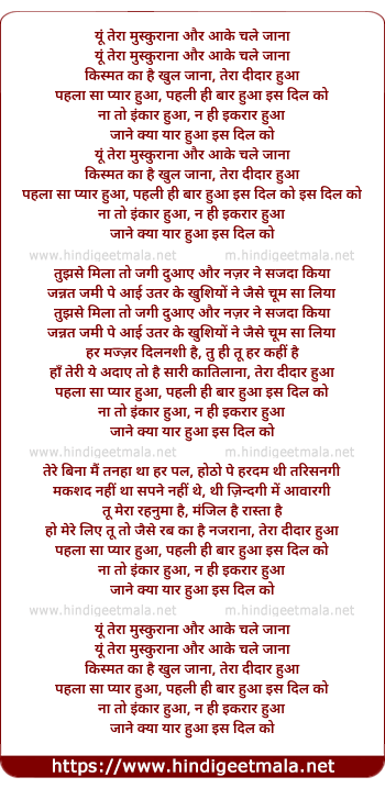 Lyrics of Tera Didar Hua Pehla Sa Pyar Hua - तेरा दीदार हुआ पहला सा प्यार हुआ