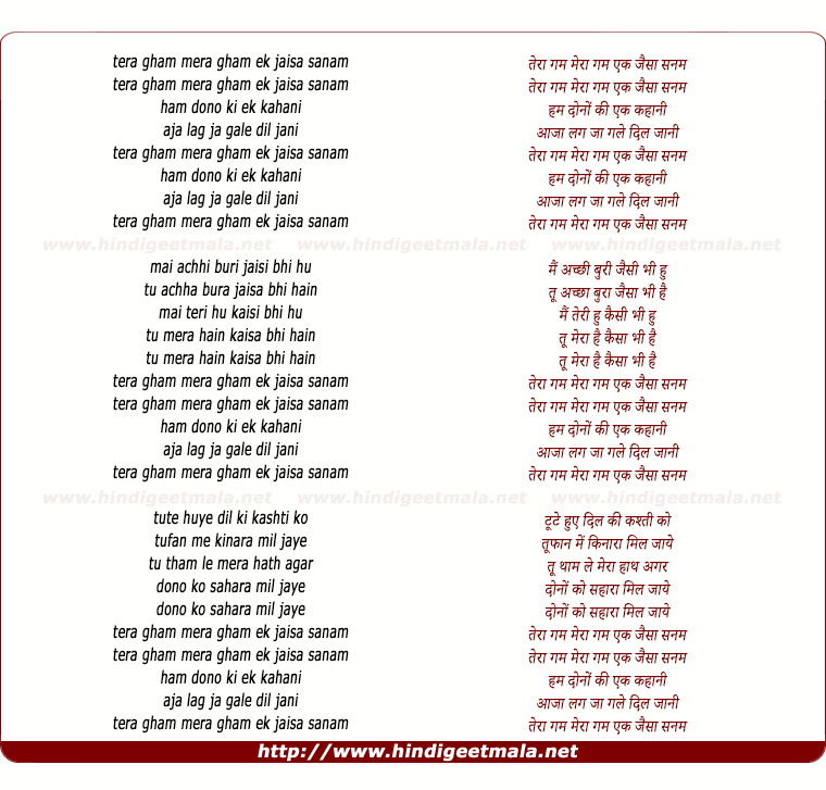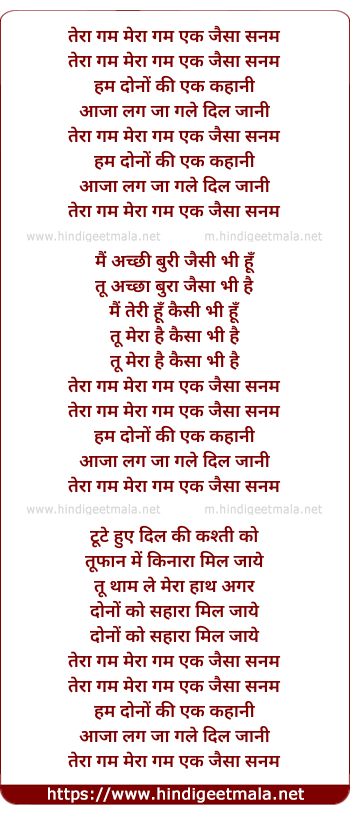 Lyrics of Tera Gam Mera Gam Ek Jaisa Sanam - तेरा गम मेरा गम एक जैसा सनम