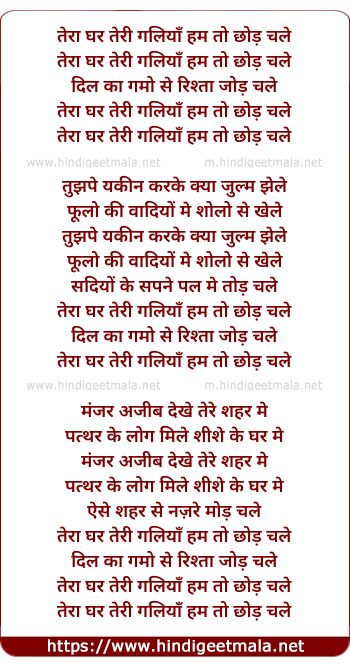 Lyrics of Tera Ghar Teri Galiyan Hum To Chhod Chale - तेरा घर तेरी गलियाँ हम तो छोड़ चले