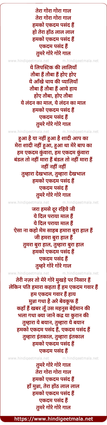 Lyrics of Tera Gora Gora Gaal - तेरा गोरा गोरा गाल
