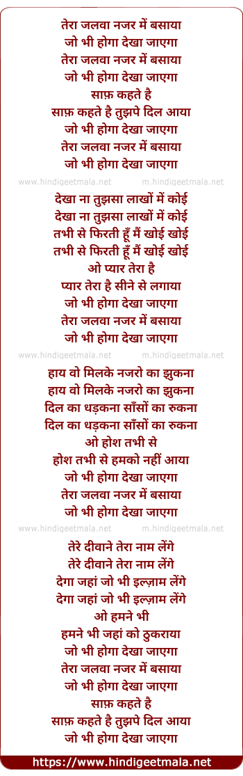 Lyrics of Tera Jalwa Nazar Me Basaya - तेरा जलवा नजर में बसाया