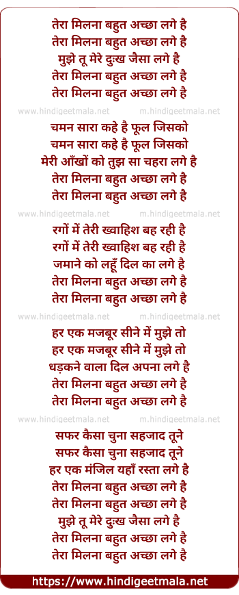 Lyrics of Tera Milna Bahut Achha Lagta Hai - तेरा मिलना बहुत अच्छा लगे है