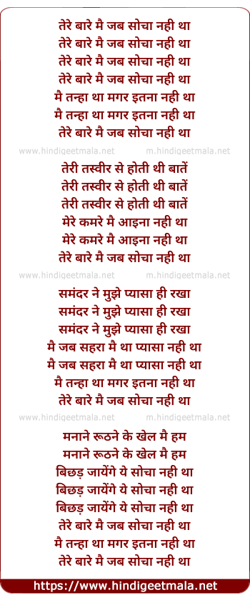 Lyrics of Tere Baare Me Jab Socha Nahi Tha - तेरे बारे मै जब सोचा नही था