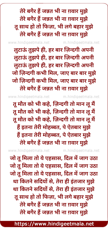 Lyrics of Tere Baghair Hai Jannat Bhi - तेरे बगैर हैं जन्नत भी ना ग़वार मुझे