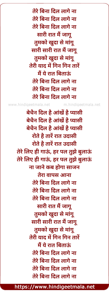Lyrics of Tere Bin Dil Lage Na - तेरे बिना दिल लागे ना