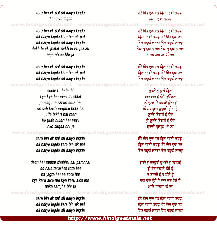 Lyrics of Tere Bin Ek Pal Dil Nahi Lagda - तेरे बिन एक पल दिल नइयो लगदा