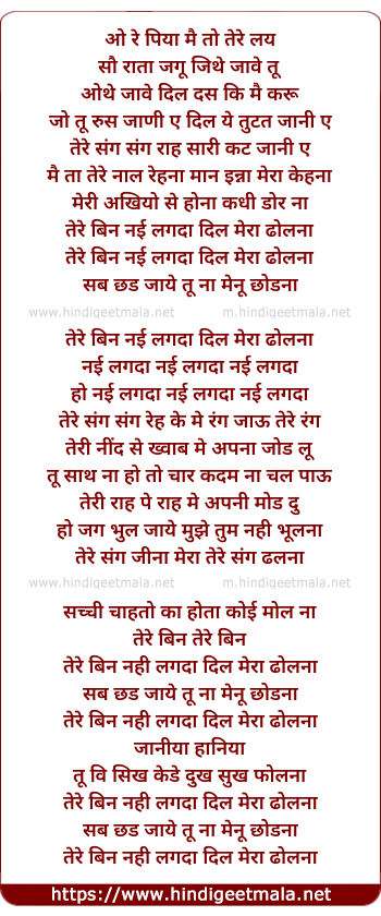 Lyrics of Tere Bin Nhi Lgda Dil Mera Dholna - तेरे बिन नहीं लगदा दिल मेरा ढोलना