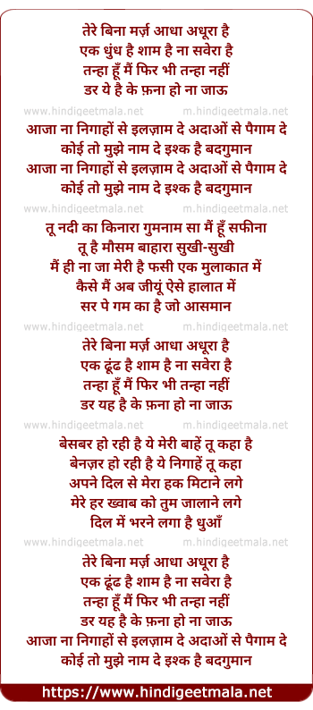 Lyrics of Tere Bina (1921-2017) - तेरे बिना (१९२१-२०१७)