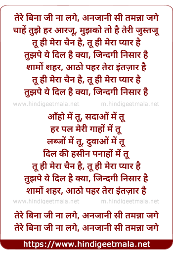 Lyrics of Tere Bina Ji Na Lage - तेरे बिना जी ना लगे, अनजानी सी तमन्ना जगे