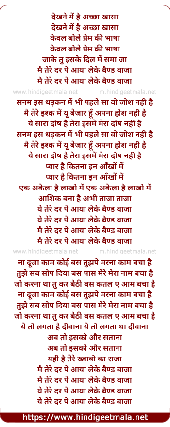 Lyrics of Tere Dar Pe Aaya Leke Band Baaja - तेरे दर पे आया लेके बैण्ड बाजा