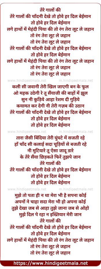 Lyrics of Tere Galo Ki Chandni Dekhe To Hove Har Dil Beimaan - तेरे गालों की चाँदनी देखे तो होवे हर दिल बेईमान